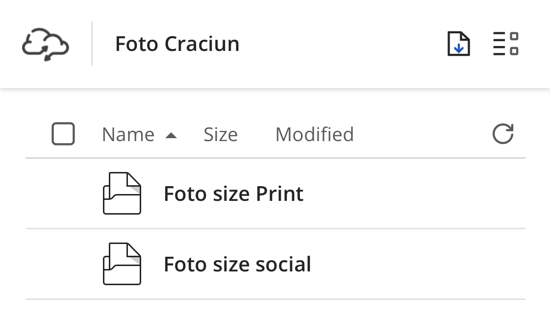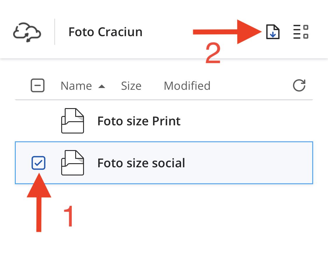 2) Selectati si bifati folderul cu marimea pozelor pe care vreti sa le descarcati(1), apoi apasati pe butonul de descarcare(2):